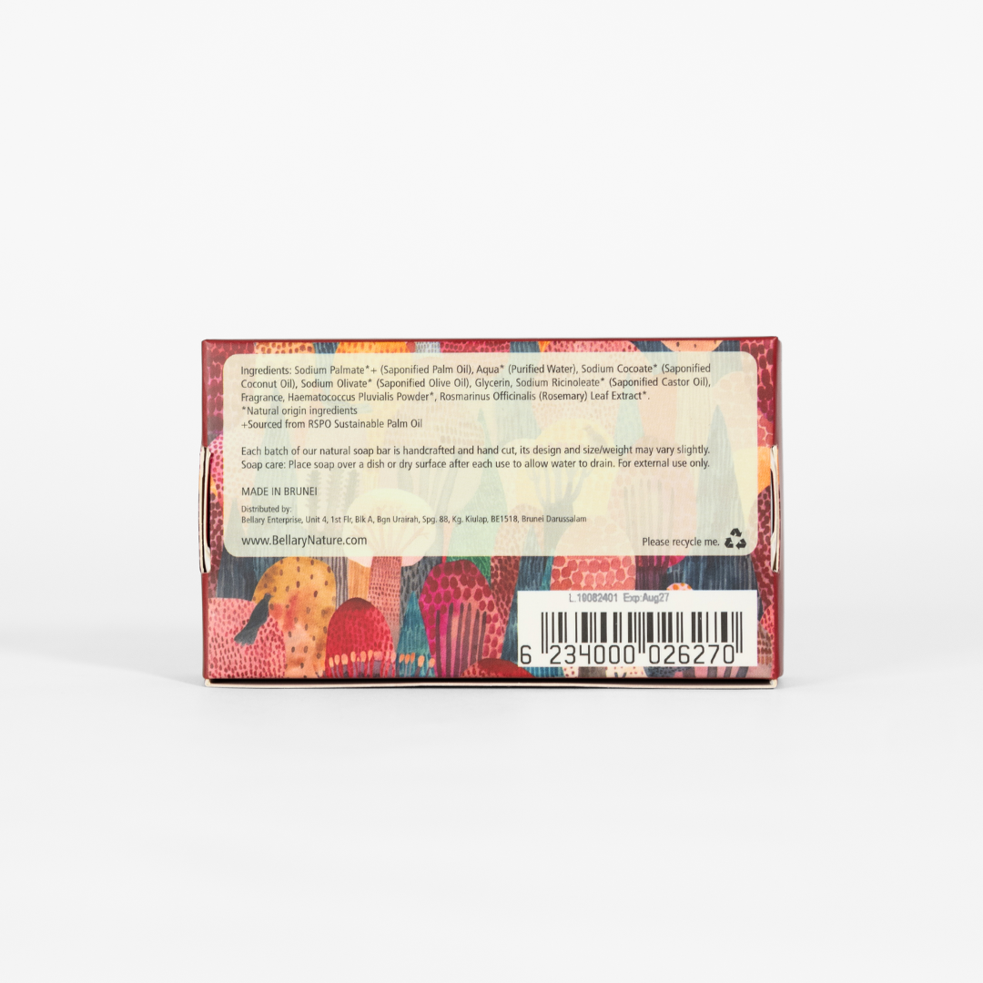 | Ingredients / Composition | "Ingredients: Elaeis Guineensis (Palm) Oil*+, Aqua* (Purified Water), Cocos Nucifera (Coconut) Oil*, Olea Europaea (Olive) Fruit Oil*, Sodium Hydroxide, Ricinus Communis (Castor) Seed Oil*, Fragrance, Haematococcus Pluvialis Oil*, Rosmarinus Officinalis (Rosemary) Leaf Extract*. |