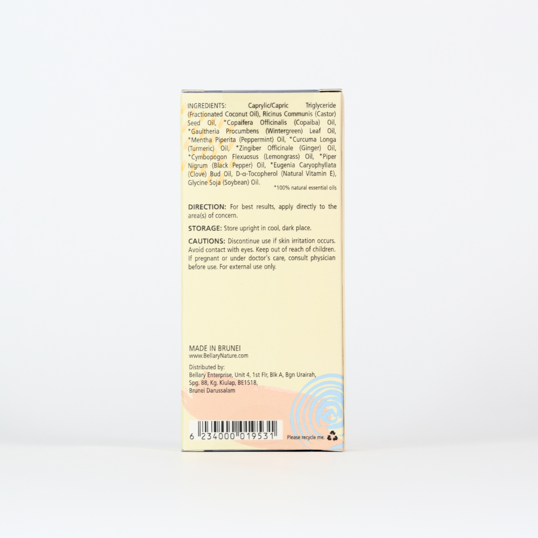 | Ingredients / Composition | "Ingredients: Caprylic/Capric Triglyceride (Fractionated Coconut Oil), Ricinus Communis (Castor) Seed Oil, *Copaifera Officinalis (Copaiba) Oil, *Gaultheria Procumbens (Wintergreen) Leaf Oil, *Mentha Piperita (Peppermint) Oil, *Curcuma Longa (Turmeric) Oil, *Zingiber Officinale (Ginger) Oil, *Cymbopogon Flexuosus (Lemongrass) Oil, *Piper Nigrum (Black Pepper) Oil, *Eugenia Caryophyllata (Clove) Bud Oil, D-α-Tocopherol (Natural Vitamin E), Glycine Soja (Soybean) Oil. |