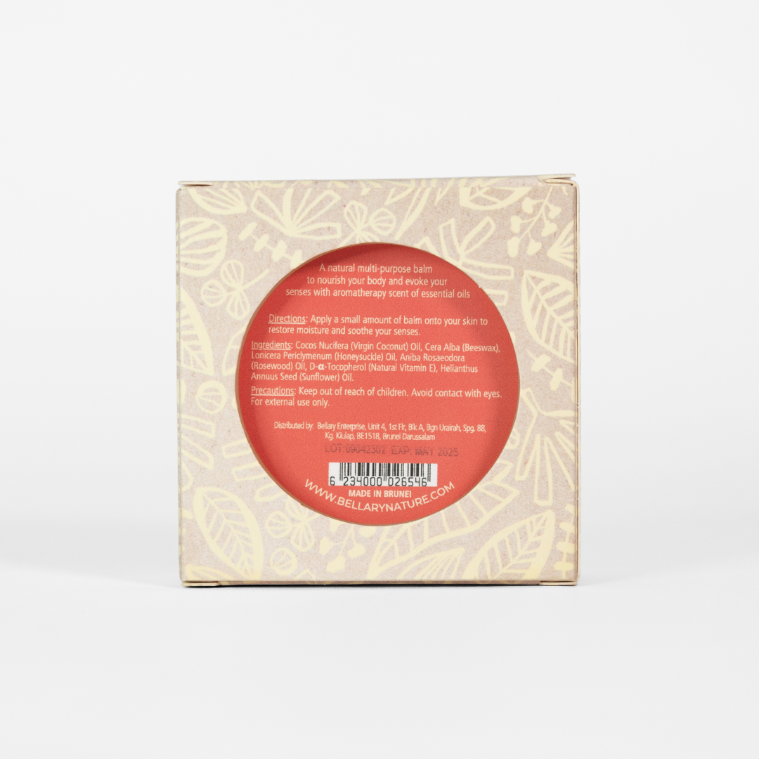 | Ingredients / Composition | Ingredients: Cocos Nucifera (Virgin Coconut) Oil, Prunus Armeniaca (Apricot) Kernel Oil, Cera Alba (Beeswax), Lonicera Periclymenum (Honeysuckle) Oil, Aniba Rosaeodora (Rosewood) Oil, D-α-Tocopherol (Natural Vitamin E), Helianthus Annuus (Sunflower) Seed Oil. |