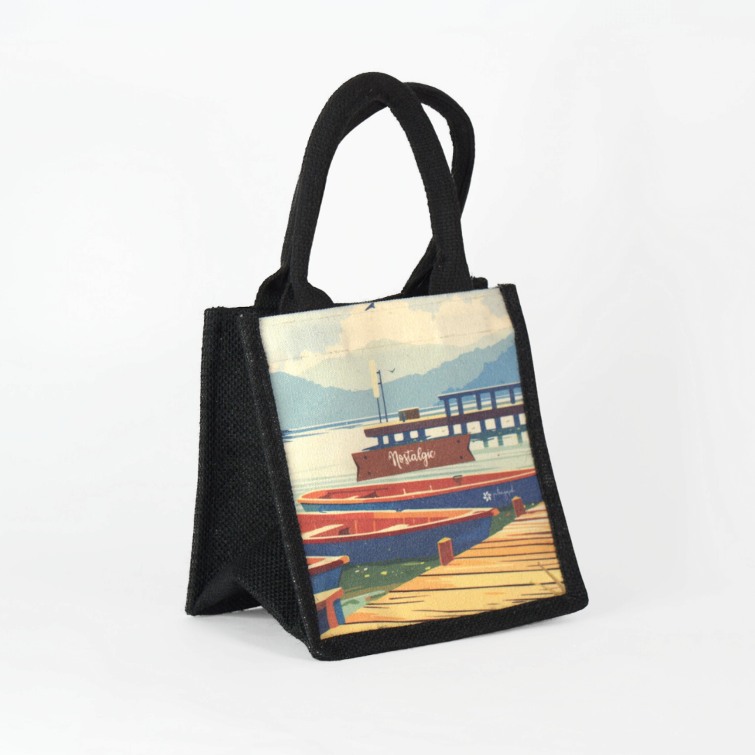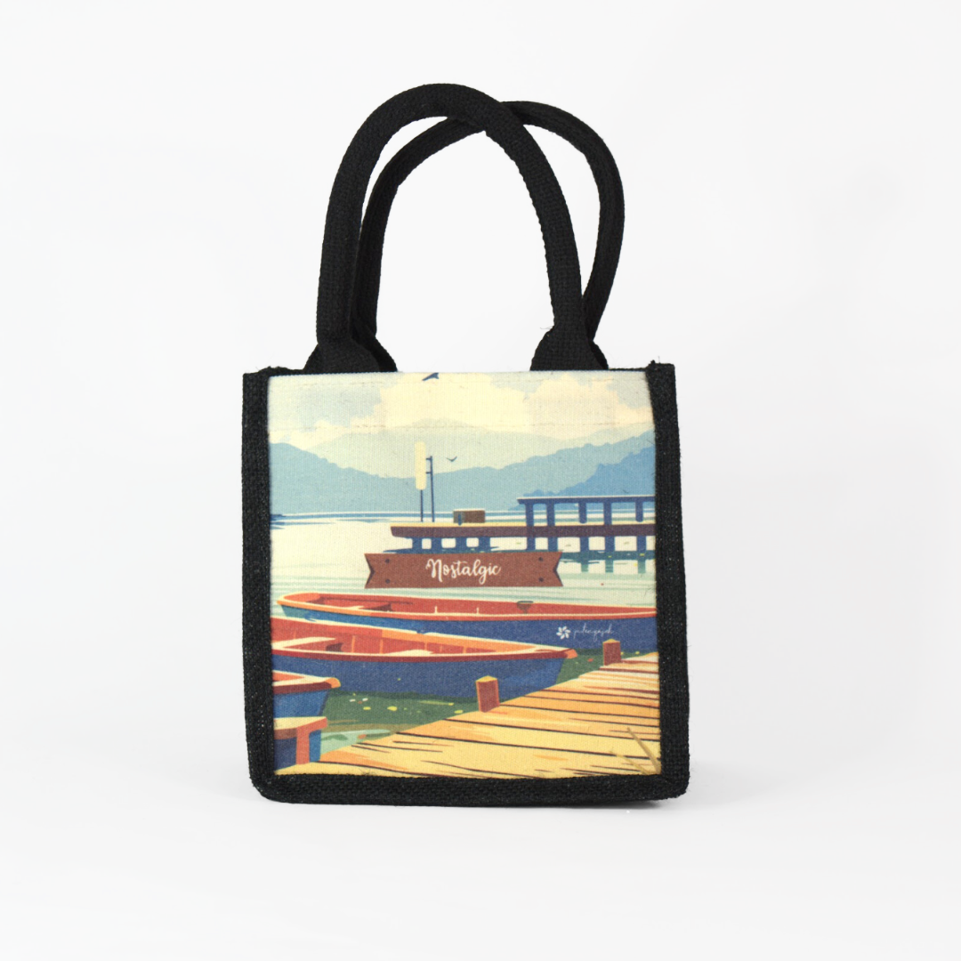 A stylish & eco-friendly way to carry your belongings. Perfect for gifting made by jute material. Inspired by Brunei water taxi. Small Jute bag size: 20cm (W) x 20cm (H) x 16.5cm (L). Optional Addname on item and it takes ETA 17 to 20 days (approximately).