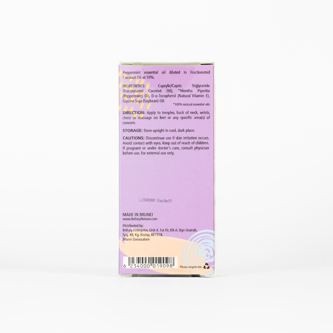 | Ingredients / Composition | "Ingredients: Caprylic/Capric Triglyceride (Fractionated Coconut Oil), *Mentha Piperita (Peppermint) Oil, D-α-Tocopherol (Natural Vitamin E), Glycine Soja (Soybean) Oil. |