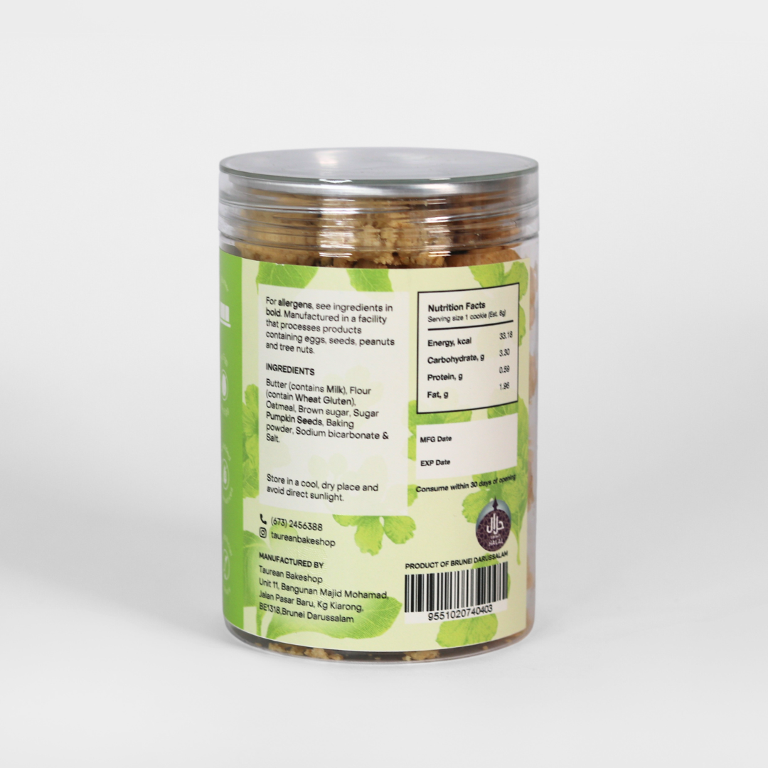 | Product Ingredients / Composition | Flour (contains wheat gluten), butter (contains milk), oatmeal, brown sugar, white sugar, pumpkin seeds, baking powder, sodium bicarbonate & salt. |