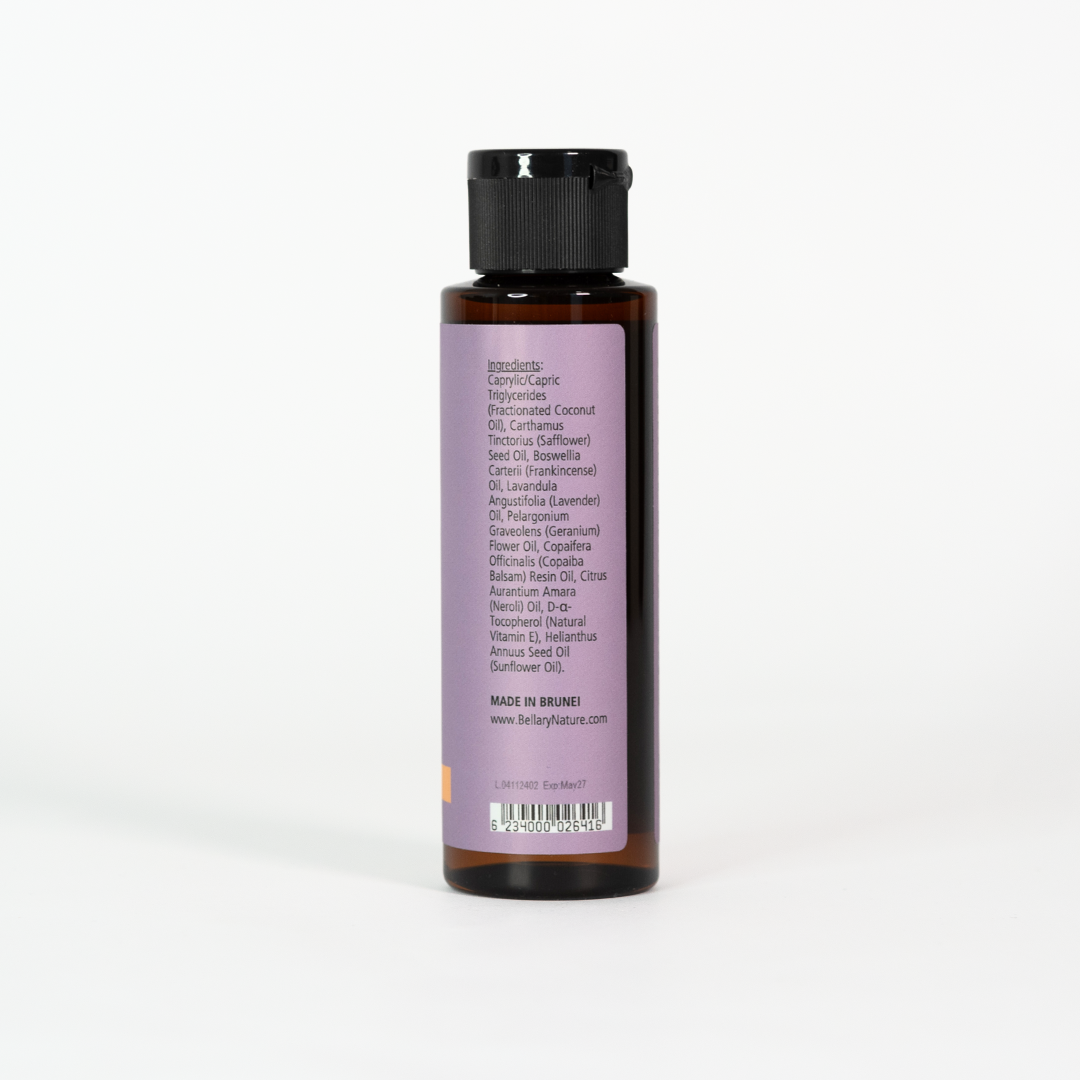 | Ingredients / Composition | Ingredients: Caprylic/Capric Triglycerides (Fractionated Coconut Oil), Carthamus Tinctorius (Safflower) Seed Oil, Boswellia Carterii (Frankincense) Oil, Lavandula Angustifolia (Lavender) Oil, Pelargonium Graveolens (Geranium) Flower Oil, Copaifera Officinalis (Copaiba Balsam) Resin Oil, Citrus Aurantium Amara (Neroli) Oil, D-α-Tocopherol (Natural Vitamin E), Helianthus Annuus Seed Oil (Sunflower Oil). |